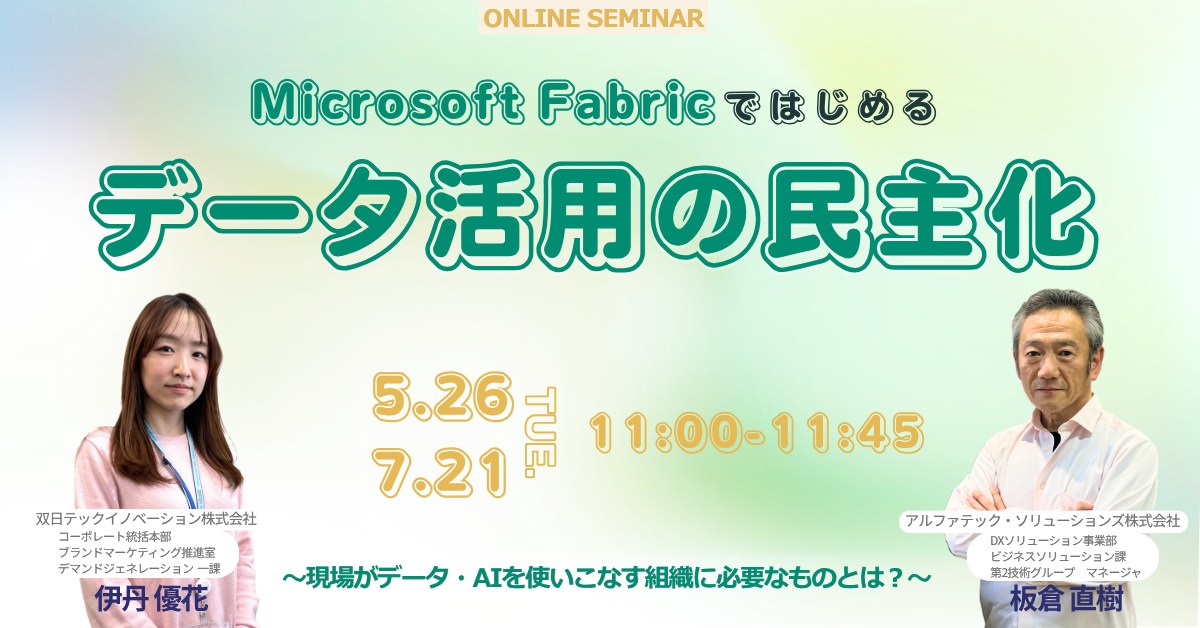 | 20分 | 第二部:Fabricを導入するとどう変わるか | 〜活用定着までのステップと現場イメージ〜 Fabric導入前後のビフォーアフターを具体的なユースケースで示し、ビジネスユーザーが主体的にデータを活用できる環境がどう実現されるかを解説。導入から活用定着までの現実的なステップも紹介します。 |