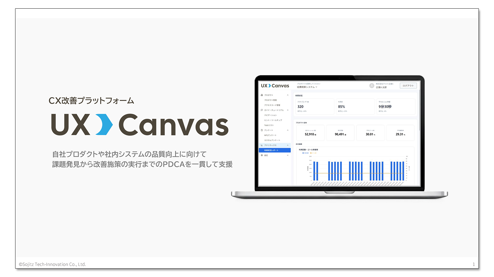 「UX Canvas」は、社内外システムやWebサイトにおける利用状況を可視化し、改善ポイントの特定から、画面上でのガイド施策まで一気通貫で実行できます。 サービス内容をまとめた詳細資料をぜひご覧ください。